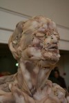 Using nylon stockings and pins as her primary materials, Dutch artist Rosa Verloop creates sculptures that appear to stem from primordial depths. Resembling both fetuses and octogenarians, her figures sit at an uncomfortable place in the life cycle between birth and death. Despite the simplicity of her chosen materials, the works appear delicate and ethereal, as if the figures are floating peacefully through a sleepy spirit world. The tan nylon stockings eerily resemble skin, which the artist folds and bends into a twisted cacophony of wrinkles that give each form a unique, organic structure. Verloop currently has work on display in the Hague Municipal Museum in the Summer Expo 2012 group show. Take a look at some images courtesy of the artist. (source http://hifructose.com)