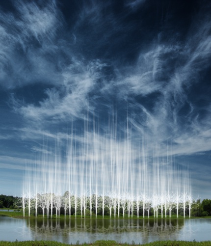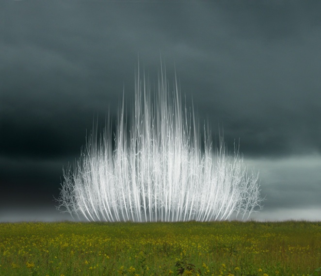 “Forests and trees have played a prominent role in many folktales and legends and have been given deep and sacred meanings. They are seen as powerful symbols of growth, decay and resurrection. I am responding by striving to make visual the ephemeral nature of sacred, spiritual realms.In this series, I am transplanting replica trees into the natural world then creating ethereal forms that blend with and supplant the natural environment. One is artificial, the other a spirit form; both represent the transcendence of nature.” – .ellenjantzen.com