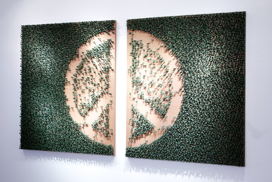 What seems to be a green peace flag from far away reveals itself as a massive war zone filled with 20.000 toy soldiers when approaching the piece.