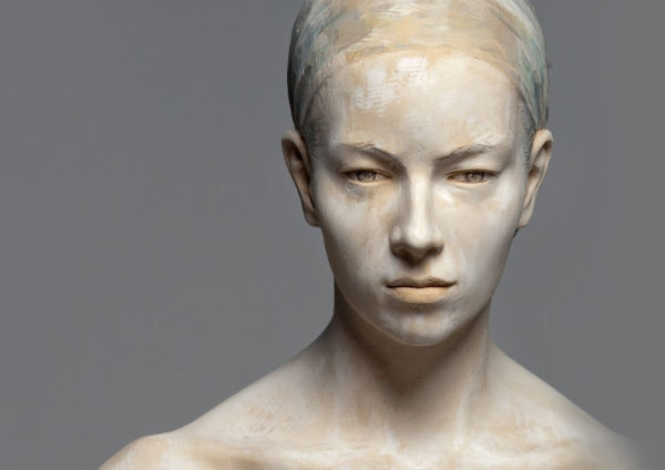Bruno Walpoth‘s human figures created from limewood or walnut come about as a result of his meeting and dealing with models. On a scale of one-to-one, the bodies, lines and forms of the few young, gaunt men and the myriad of beautiful women take shape from the block of wood by means of his hands. Although Walpoth is attracted to producing concrete likenesses of body parts, such as a shoulder or ankle, and he is pleased with the successful outcome, his concern is not only for a hyper-realistic portrait of the person who stands before him: In his or her outward appearance, the model serves as a cover surface for implied projections. Granted, the facial features and body forms correspond to those of the models, but Bruno Walpoth reduces the strong individual characteristics of the personality in his sculptural representation – those that would constitute the individuality in the classical sense of the portrait.