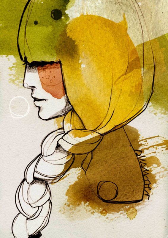 She is known for her distinctive female portraits and silhouette, layered expressively with a mixture of organic pencil strokes against colourful ink washes.